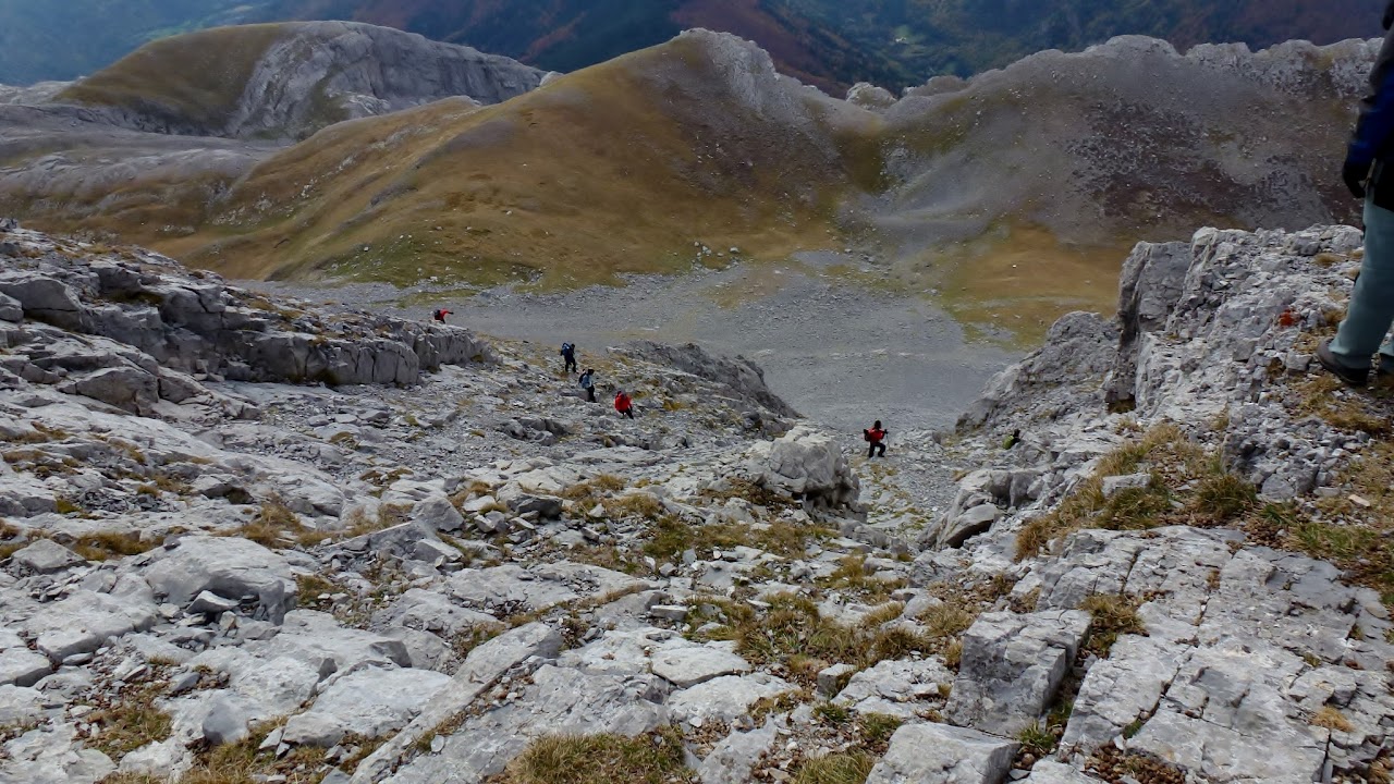 Volveremos a bajar de la pequeña morra que hemos tenido que subir para hacer la cumbre y habrá que tomar dirección a la drcha, pegados a la pared de la montaña y continuar en un descenso corto, siguiendo la misma pared, para después hacer un giro a la drcha y hacer un flanqueo por lanchas rocosas rotas, sin perder altura y con especial cuidado. Este tramo es el más delicado que una vez salvado el camino continua con hitos a la vista.