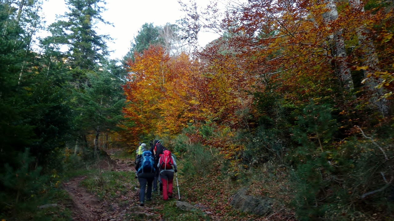 La temperatura era buena para andar por la montaña y lucía un cielo azul cuando dejamos el autocar y nos disponíamos a iniciar nuestro recorrido en busca del barranco de Estriviella. Nos adentramos en el bosque y empezamos a ver su colorido otoñal con la senda llena de hojas de color cobrizo y las hayas dejando entrar una luz tamizada al interior del bosque.